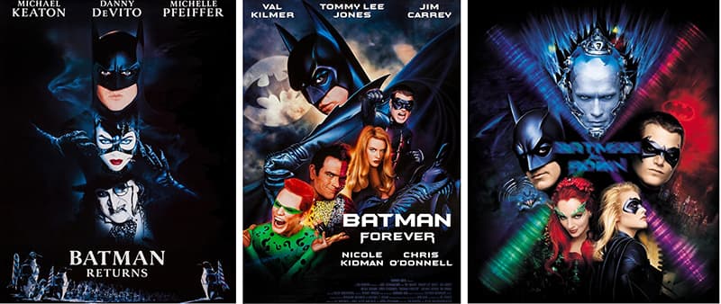 然而,1995年,乔尔·舒马赫执导,并于同年上映的《永远的蝙蝠侠》(Batman Forever)改变了蝙蝠侠电影的基调。瓦尔·基默饰演的蝙蝠侠,其哥谭市的色彩比伯顿的电影更加丰富多彩、生动活泼。紧随其后的是1997年的《蝙蝠侠与罗宾》(Batman & Robin),这部电影因其夸张的风格和夸张的表演而臭名昭著,由乔治·克鲁尼饰演蝙蝠侠。这部电影实际上标志着蝙蝠侠电影一个时代的结束,直到2000年代才得以延续。