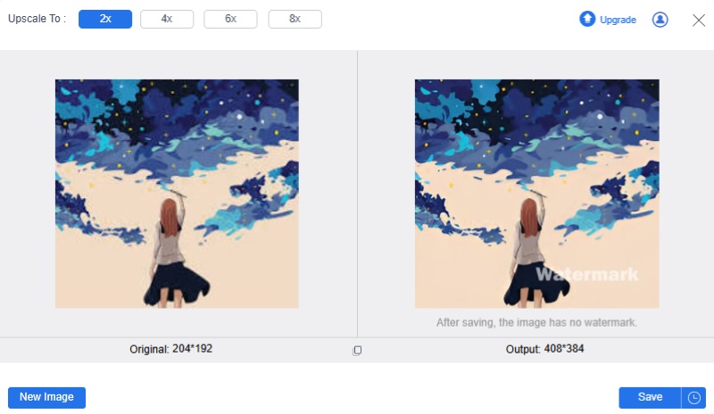 Pokud chcete změnit velikost fotografie online pomocí telefonu, musíte přejít do prohlížeče a navštívit stránku Online Upscaler obrázků zdarma MindOnMap. Poté kliknutím na tlačítko Nahrát obrázky budete moci importovat soubor fotografie z galerie. Poté klikněte na požadovanou možnost zvětšení a na tlačítko Uložit.