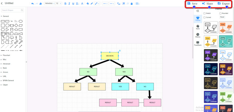 Diagram můžete začít vytvářet přidáním tvarů a textu na obrazovku v této části. Chcete-li přidat tvary, přejděte do levé části rozhraní a podívejte se na Všeobecné volba. Jsou tu také Témata na pravém rozhraní. Můžete také vložit šipky pro spojování tvarů. Poté poklepejte na tvary a vložte do nich text. Přejít na Vyplň barvu možnost na horním rozhraní změnit barvu tvarů.