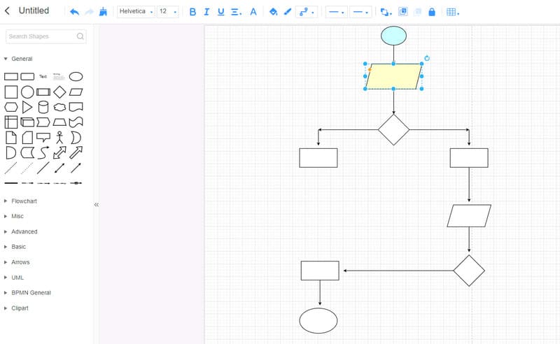 Nyní můžete začít vytvářet svou mapu. Chcete-li začít, přejděte na Všeobecné a přetáhněte tvary na obyčejné plátno. Můžete také použít výše uvedené funkce, abyste své mapě přidali více chuti. Můžete přidat barvu, styl písma, tabulky a další. Chcete-li do tvaru přidat text, poklepejte na tvar a začněte psát obsah.