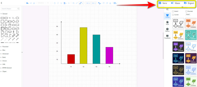 Kromě toho jsou v tomto softwaru k dispozici témata. To znamená, že můžete dát svému pozadí sloupcového grafu chuť. Tímto způsobem můžete získat barevný a atraktivní graf při porovnání určitých konceptů. Jednou z funkcí, kterou můžete při používání tohoto nástroje najít, je funkce snadného sdílení. Pokud chcete brainstorming se svými spoluhráči nebo jinými uživateli, je to možné. Funkce snadného sdílení vám umožní odeslat graf s ostatními pro případ kolize nápadů. Tímto způsobem nemusíte s ostatními uživateli mluvit osobně. Vše, co potřebujete, je posílat své práce a získávat z nich nové myšlenky. Přístup k MindOnMap je jednoduchý. Bez ohledu na to, jaké zařízení používáte, pokud má prohlížeč, můžete přistupovat k MindOnMap. Nakonec můžete svůj sloupcový graf exportovat v různých formátech pro další uchování. Můžete zajistit, že váš výstup nebude rychle smazán nebo nezmizí. Chcete-li vytvořit sloupcový graf, můžete postupovat podle nejpřímějších výukových programů níže.