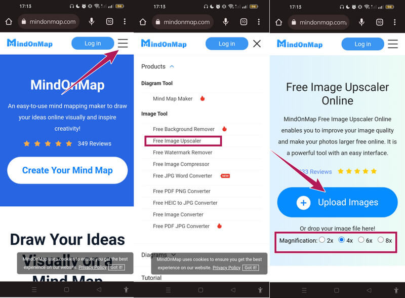 Navštivte oficiální stránky MindOnMap pomocí prohlížeče vašeho Androidu. Poté, jakmile se dostanete na stránku, klepněte na Elipsu, abyste ji viděli Zdarma Image Upscaler nástroj v části Produkt.