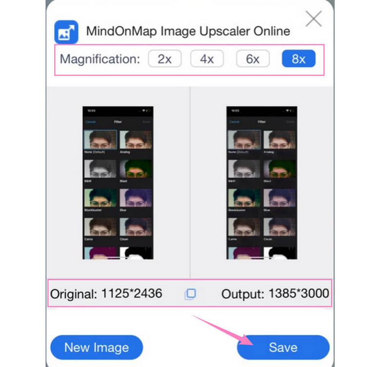 Pokud nejste spokojeni s nastavením, které aplikace Fotky poskytuje, nebo s výstupem, který vám tato aplikace poskytla, pak je vynikající alternativou online nástroj. Možná budete chtít použít nejdostupnější nástroj ke změně velikosti fotografií pro tapetu iPhone a fotografie zdarma Online Upscaler obrázků zdarma MindOnMap. Jedná se o online nástroj s efektivním postupem, jak po změně velikosti udělat z vašeho iPhonu kvalitní fotografie. Kromě toho nebudete muset na svůj drahý iPhone nebo iPad nic instalovat, protože k němu máte přístup, pokud máte internet. Mezitím vás překvapí, že dokáže změnit velikost vašich fotografií až 8krát a vrátit je do původní velikosti, aniž by to ovlivnilo jejich kvalitu. Díky pokročilé technologii umělé inteligence, která pomáhá zvětšování a vylepšování být zdánlivě efektivní.