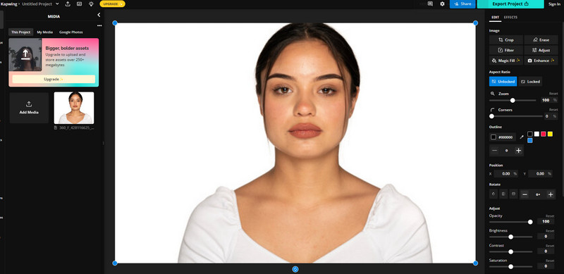 Pokud dáváte přednost úpravě fotografie ze zelené karty online, dalším účinným editorem je Kapwing. Pomocí tohoto nástroje můžete svou fotografii upravovat různými způsoby. Můžete oříznout fotografii, upravit barvu obrázku, odstranit nepotřebné prvky a další. Do obrázku můžete přidat a upravit filtry, aby byl lepší a atraktivnější. Pokud jde o úpravu fotografií, můžete zvážit použití Kapwing jako editoru fotografií. Při používání programu však existují určité nevýhody. Ke správnému fungování vyžaduje připojení k internetu. Před získáním upraveného obrázku si také musíte nejprve vytvořit účet, což je časově náročné. A konečně, pokud chcete zažít všechny jeho funkce, musíte si pořídit plán předplatného.