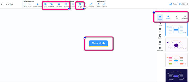 түймесін басыңыз Негізгі түйін таңбалардың атын қосу опциясы. пайдаланыңыз Түйін және Ішкі түйіндер қосымша таңбаларды қосу опциялары. Сіз сондай-ақ пайдалана аласыз Қатынас кейіпкерді басқа таңбалармен байланыстыру опциясы. Сондай-ақ, түйіндерге сурет қосу үшін түймесін басыңыз Кескін белгішесі. Отбасылық ағашыңызға түстер беру үшін түймесін басыңыз Тақырып, Түс, және Фон опциялар.