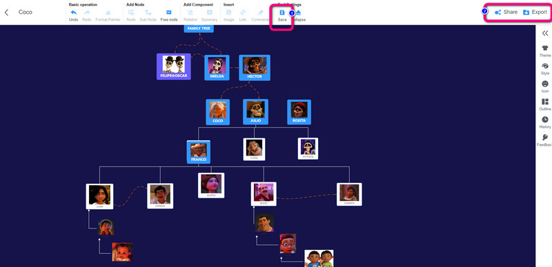 түймесін басыңыз Сақтау Coco отбасылық ағашыңызды сақтау үшін жоғарғы интерфейстегі түймені басыңыз. Отбасылық ағашыңызды PDF, PNG, JPG және басқа пішімдер ретінде сақтағыңыз келсе, түймесін басыңыз Экспорттау түймесі. Сондай-ақ түймесін басуға болады Бөлісу MindOnMap тіркелгісінен шығыс сілтемесін көшіру үшін түймесін басыңыз.
