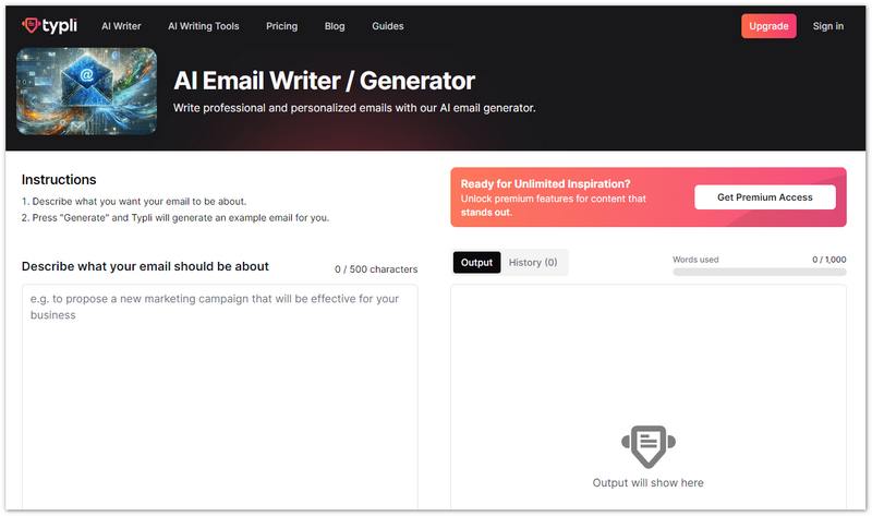 Typli.AI គឺជាអ្នកសរសេរអ៊ីមែល AI ដែលបង្កើតអ៊ីមែលតាមការណែនាំរបស់អ្នក។ គ្រាន់តែបញ្ចូលបំណងរបស់អ្នក ហើយចុចបង្កើត ដើម្បីទទួលបានអ៊ីមែលពេញលេញយ៉ាងឆាប់រហ័ស។ វាមានចំណុចប្រទាក់ច្បាស់លាស់ និងមិនមានប៉ារ៉ាម៉ែត្រជាច្រើនសម្រាប់អ្នកដើម្បីកែតម្រូវ។ គ្រាន់តែបញ្ចូលការបញ្ជាទិញ និងតម្រូវការក្នុងប្រអប់ នោះវានឹងផ្តល់លទ្ធផលភ្លាមៗ។