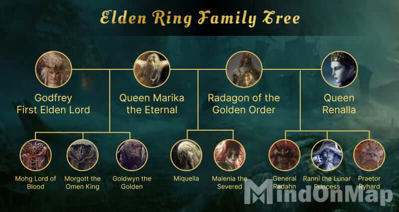 ដោយផ្អែកលើដើមឈើគ្រួសារ Elden Ring មានតួអង្គសំខាន់ៗចំនួនបួន។ ពួកគេគឺ Godfrey, Queen Mrika, Radagom និង Queen Renalla ។ Godfrey គឺជា Elden Lord ទីមួយ។ ដៃគូរបស់គាត់គឺម្ចាស់ក្សត្រី Marika the Eternal ។ ពួកគេមានកូនបី។ ពួកគេគឺ Mohg, Morgott និង Goldwyn ។ Mohg គឺជាម្ចាស់នៃឈាម។ Morgott គឺជាស្តេចប្រផ្នូល ហើយ Goldwyn ត្រូវបានគេស្គាល់ថាជា Golden ។ ដោយ​ផ្អែក​លើ​មែកធាង​គ្រួសារ ព្រះនាង​ម៉ារីកា ក៏​មាន​ដៃ​គូ​មួយ​ទៀត​ឈ្មោះ រ៉ាដា នៃ​លំដាប់​មាស។ Marika និង Radagon មានកូនពីរនាក់គឺ Miqualla និង Melania ។ លើសពីនេះទៅទៀតមានម្ចាស់ក្សត្រី Renalla ។ ដៃគូរបស់នាងគឺ Radagon ។ ពួកគេមានកូនបី។ ពួកគេគឺឧត្តមសេនីយ៍ Radahn, Ranni, Lunar Princess និង Rykard ។ អ្នកអាចជួបតួអង្គសំខាន់ៗទាំងនេះ នៅពេលលេងហ្គេម Elden Ring។