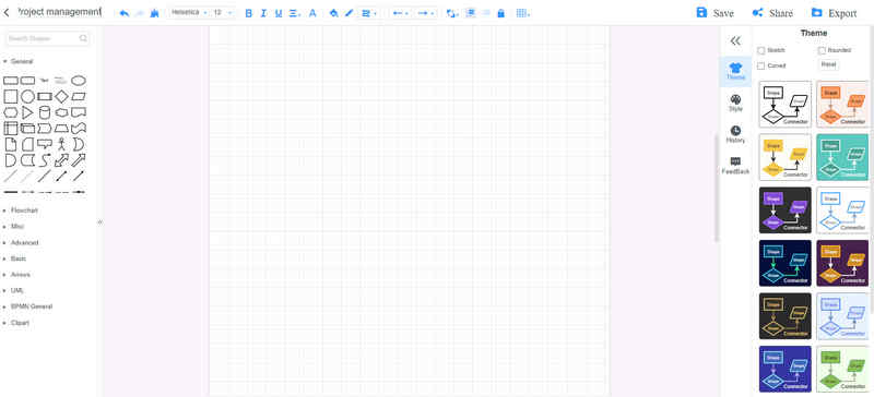នៅក្នុងផ្នែកនេះ អ្នកអាចមើលឃើញចំណុចប្រទាក់សំខាន់នៃ ឧបករណ៍គ្រប់គ្រងគម្រោង. នៅលើចំណុចប្រទាក់ខាងឆ្វេង អ្នកអាចមើលឃើញរាងផ្សេងៗដែលអ្នកអាចប្រើសម្រាប់ការគ្រប់គ្រងគម្រោងរបស់អ្នក។ អ្នកអាចឃើញឧបករណ៍មានប្រយោជន៍បន្ថែមទៀតនៅលើចំណុចប្រទាក់ខាងលើ ដូចជាតារាង ការបំពេញពណ៌ រចនាប័ទ្មពុម្ពអក្សរ។