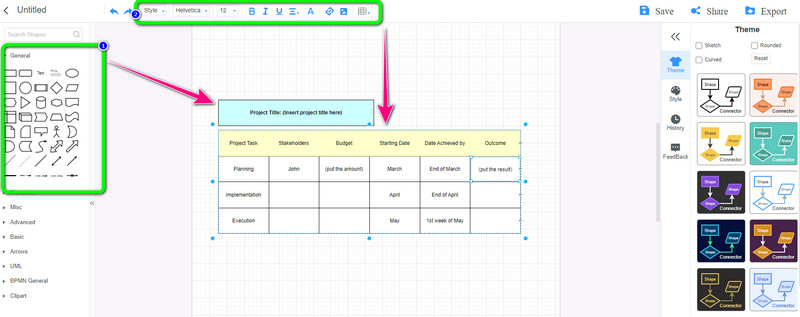 អ្នកអាចចាប់ផ្តើមប្រើប្រាស់ធាតុទាំងនេះសម្រាប់ការគ្រប់គ្រងគម្រោងរបស់អ្នក។ អូស រាង នៅលើផ្ទាំងក្រណាត់។ បន្ទាប់មក ដើម្បីបញ្ចូលអត្ថបទនៅក្នុងរាង សូមចុចពីរដងទៅឆ្វេងលើរាង។ ប្រើ ការបំពេញពណ៌ ជម្រើសនៅលើចំណុចប្រទាក់ខាងលើដើម្បីដាក់ពណ៌មួយចំនួននៅលើរាង។