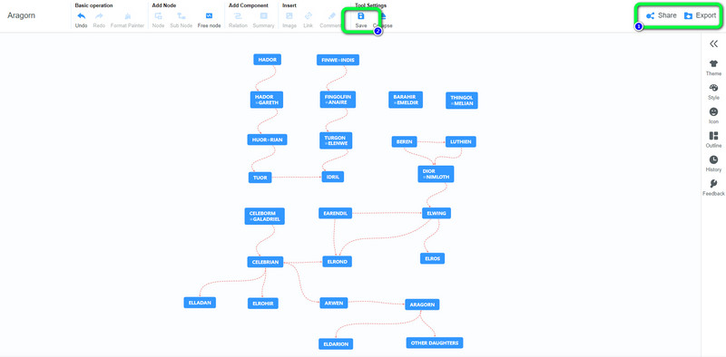 ಅರಗೊರ್ನ್ ಕುಟುಂಬ ವೃಕ್ಷವನ್ನು ರಚಿಸಲು ನೀವು ಮಾಡಿದ ಪ್ರಕ್ರಿಯೆಯ ನಂತರ, ನೀವು ಈಗ ಉಳಿಸುವ ಪ್ರಕ್ರಿಯೆಗೆ ಮುಂದುವರಿಯಬಹುದು. ನಿಮ್ಮ ಕಂಪ್ಯೂಟರ್ನಲ್ಲಿ ಕುಟುಂಬ ವೃಕ್ಷವನ್ನು ಡೌನ್ಲೋಡ್ ಮಾಡಲು ನೀವು ಬಯಸಿದರೆ, ಬಳಸಿ ರಫ್ತು ಮಾಡಿ ಆಯ್ಕೆಯನ್ನು. ನೀವು ರೇಖಾಚಿತ್ರವನ್ನು PDF, JPG, PNG, SVG ಮತ್ತು ಹೆಚ್ಚಿನವುಗಳಾಗಿ ಉಳಿಸಬಹುದು. ನೀವು ಸಹ ಹೊಡೆಯಬಹುದು ಹಂಚಿಕೊಳ್ಳಿ ಉಪಕರಣದ ಸಹಯೋಗದ ವೈಶಿಷ್ಟ್ಯವನ್ನು ಅನುಭವಿಸುವ ಆಯ್ಕೆ. ಅಲ್ಲದೆ, ನಿಮ್ಮ ಖಾತೆಯಲ್ಲಿ ಕುಟುಂಬ ವೃಕ್ಷವನ್ನು ಉಳಿಸಲು, ಕ್ಲಿಕ್ ಮಾಡಿ ಉಳಿಸಿ ಮೇಲಿನ ಇಂಟರ್ಫೇಸ್ನಿಂದ ಬಟನ್.