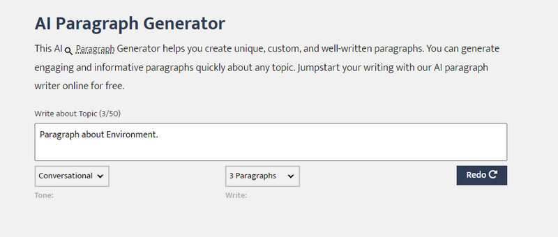Ben jij een schrijver die een creatieve paragraaf wil maken? Wij adviseren het gebruik van de ToolBaz-AI Paragraafgenerator. Zoals we allemaal weten, is het maken van creatieve inhoud een uitdaging. U moet weten hoe u verschillende woorden correct gebruikt om meer lezers te trekken. Als u over deze tool beschikt, kunt u er zeker van zijn dat deze u kan helpen bij het genereren van boeiende en creatieve inhoud. Het beste hier is dat u de tool eenvoudig kunt bedienen, omdat deze een eenvoudige lay-out heeft. Bovendien heeft ToolBaz, net als de andere hierboven genoemde AI-tools, een snelle procedure voor het genereren van zinnen. Het enige probleem hier is dat ToolBaz niet meerdere talen kan ondersteunen. U kunt alleen een paragraaf in het Engels genereren. Maar als je meer inhoud wilt creëren zonder veel tijd te verspillen, kun je het beste vertrouwen op deze gratis AI-paragraafgenerator.