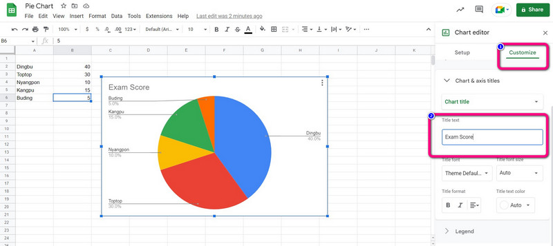 ඔබට Google Sheets හි පයි ප්රස්ථාරයක මාතෘකාව වෙනස් කරන ආකාරය ඉගෙන ගැනීමට අවශ්ය නම්, වෙත යන්න අභිරුචිකරණය කරන්න අංශය. ඉන්පසු මාතෘකාව යටතේ ටයිප් කිරීම ආරම්භ කරන්න මාතෘකා පෙළ විකල්පය.