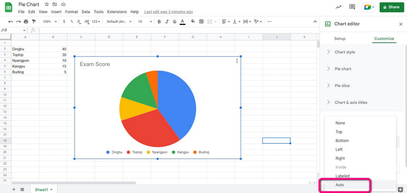 ඔබට පෙනෙන පරිදි, තොරතුරු ප්රස්ථාරයේ ඇති අතර, ප්රතිශතය ස්වයංක්රීයව දිස්වනු ඇත. ඔබට Google Sheets හි ප්රතිශතය එකතු කරන්නේ කෙසේදැයි දැන ගැනීමට අවශ්ය නම්, වෙත යන්න අභිරුචිකරණය කරන්න අංශය. ඉන්පසු, ක්ලික් කරන්න පුරාවෘත්තය > ස්ථානය සහ තෝරන්න ඔටෝ විකල්පය. එවිට, ප්රතිශතය පයි ප්රස්ථාරයේ දිස්වනු ඇත.