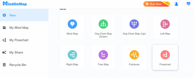 您可以访问 MindOnMap 主网站并免费获取该工具。将其安装到您的电脑上并访问 新的 按钮。要开始创建奥萨马·本·拉登的家谱,我们应该使用 流程图 特征。
